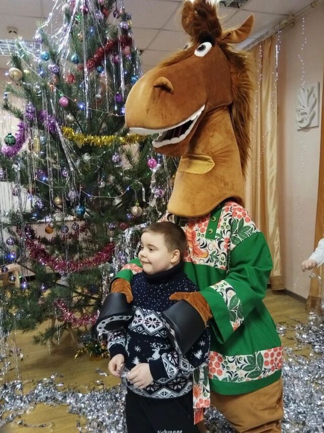 После веселого представления дети сели за праздничный стол, чтобы угоститься и пообщаться, поделиться впечатлениями от своих подарков. А после красивого и вкусного торта всех ждал еще один сюрприз — игры и танцы с лошадкой Юлием из всеми любимого мультика про богатырей. По сюжету фильма, Юлий — никогда и ни за что не унывающий конь, он веселый и находит выход из любой ситуации. Поэтому это была еще одна мотивация и зарядка для наших детей на будущий год.